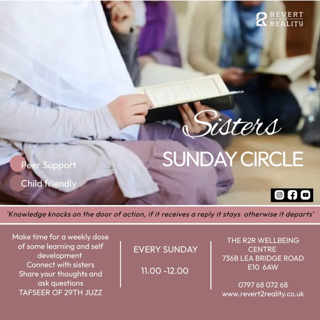 At Revert2Reality, you’ll find guidance, sisterhood and brotherhood, structured learning, and genuine aftercare designed to help you grow with confidence, clarity, and connection to Allah.