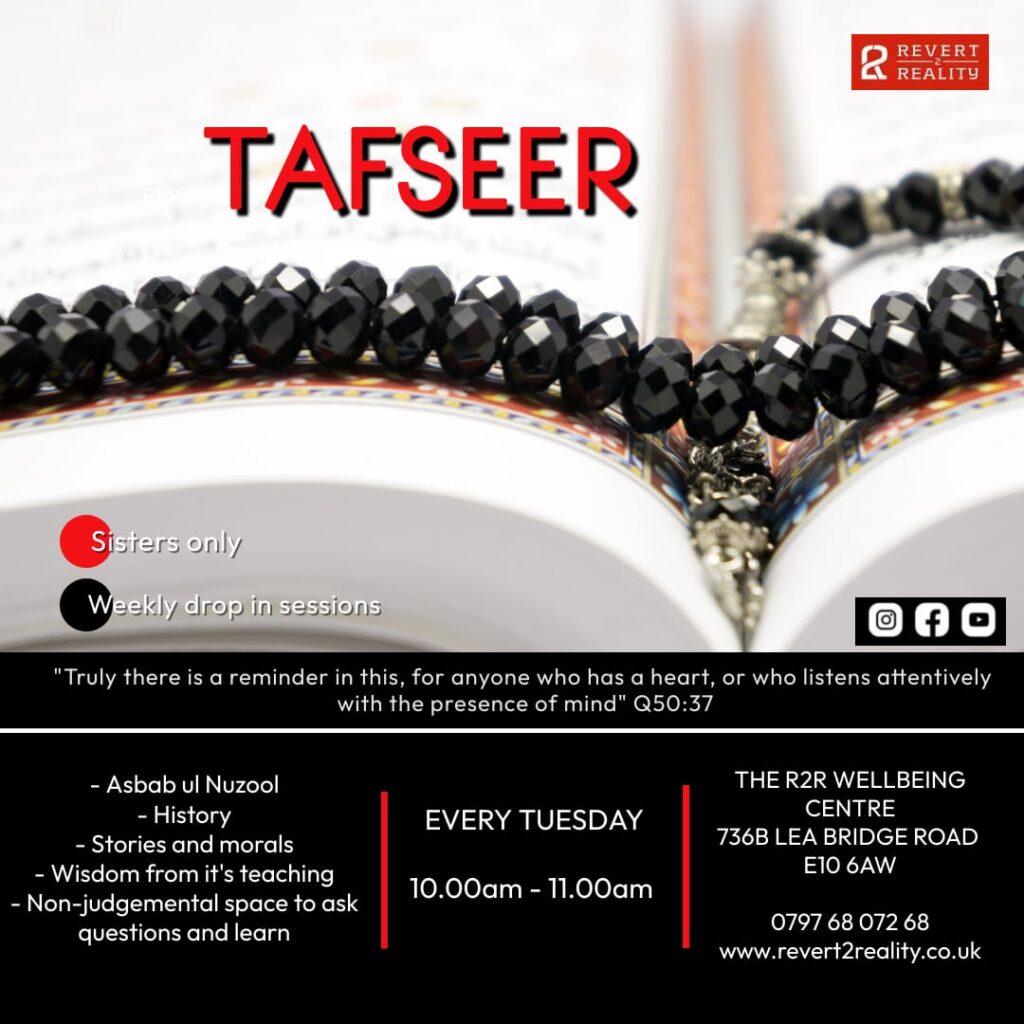 Join us at the R2R Wellbeing Centre on Tuesdays at 11am to learn stories and morals from the quran, as well as explanations of what the Quran teaches us and wisdom from it.